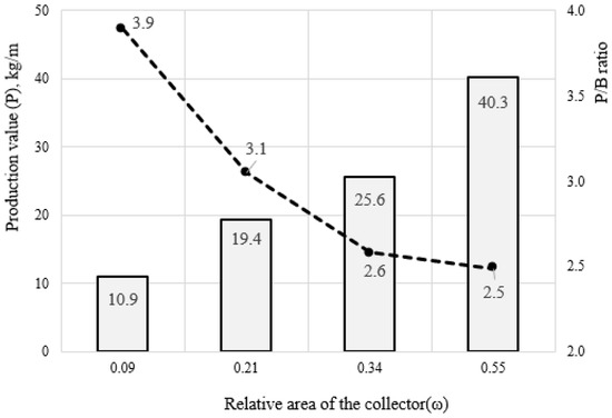 Thus, with a change in the relative area of the collector, the mussels’ production increases, but the specific production (P/B ratio) decreases.