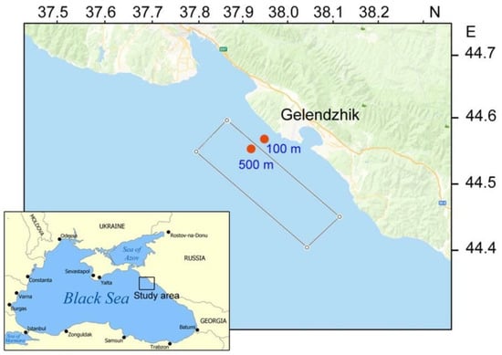 Map of the study area. The dots show the locations of two stations at 100 m and 500 m. The rectangle shows the area for the satellite scanner’s estimates of chlorophyll-a concentration.