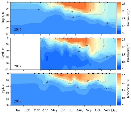 Vertical distribution of temperature at the station above a depth of 500 m in 2016, 2017, and 2019.