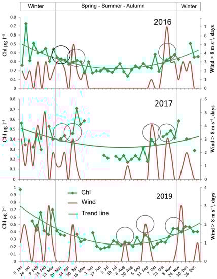 Seasonal dynamics of chlorophyll-a (Chl) concentration against the background of strong wind (number of days with wind >8 m s−1 in an 8-day period) during 2016, 2017, and 2019. The trend line is a polynomial function. Vertical gray lines show the boundaries between hydrological periods with a non-stratified (winter) and stratified (spring, summer, autumn) water column. Cycles indicate the coincidence of strong wind effects and Chl increases above the annual trend line.