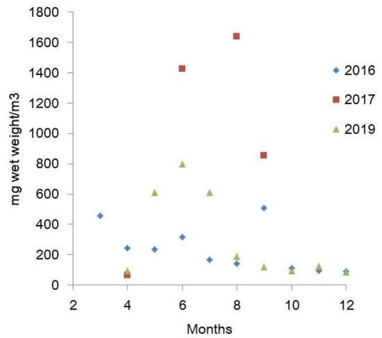 Monthly maximum of the total biomass (B, mg m−3) of phytoplankton in 2016, 2017, and 2019.