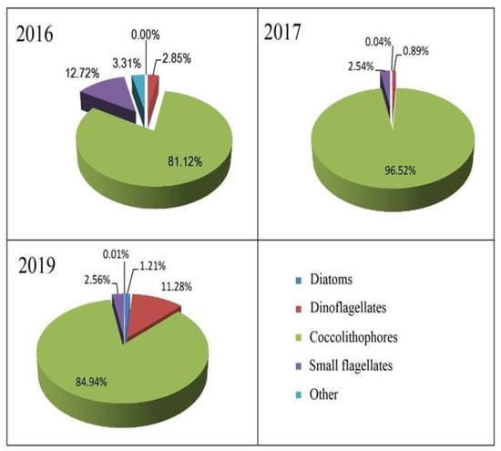 Taxonomic composition of phytoplankton biomass at the end of spring and in the early summer during the period of bloom of Emiliania huxleyi in 2016, 2017, and 2019.