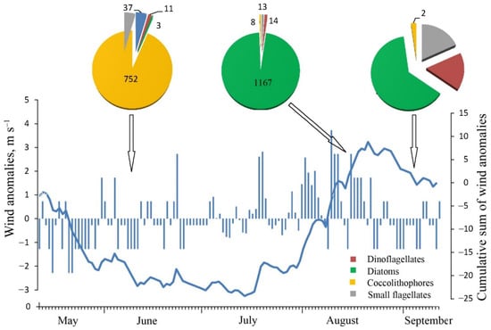 Daily wind anomalies from average speed for 4-month (bars) and cumulative sum of wind anomalies (line) during the period from 12 May to 12 September 2017. The diagrams show the average biomass (mg m−3) of the main groups of phytoplankton in the upper 10-m layer on 7 June, 15 August, and 4 September 2017 (data are shown by arrows).