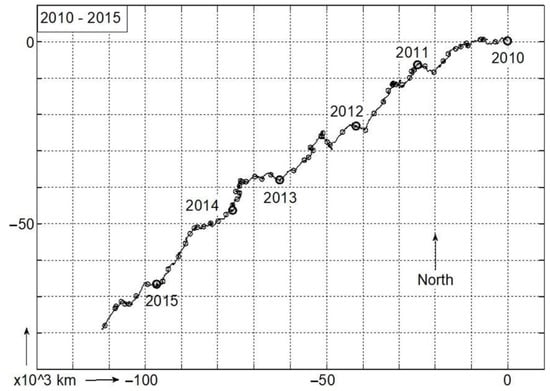 The wind regime observed in 2016, 2017, and 2019 did not differ significantly from previous years, as seen from the progressive vector diagram (Figure 7). From 2010 to 2015, the annual cycle was dominated by NE winds. The wind direction changes in the spring months. The interannual differences were in the shift of the timing of the change of the wind regime.
