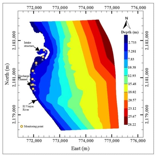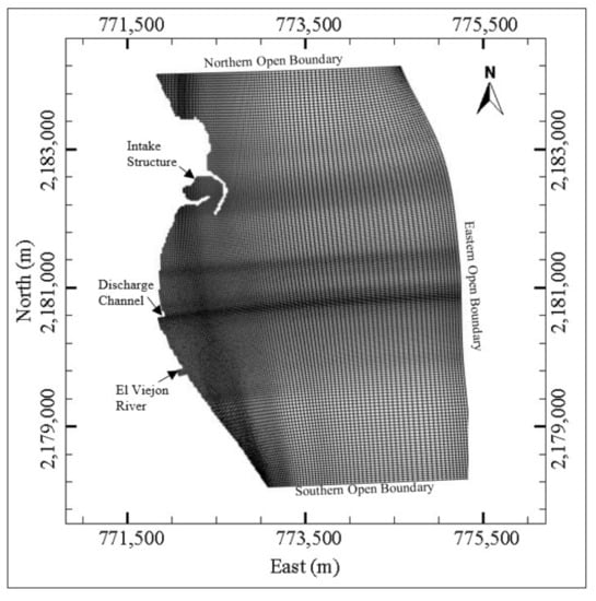 The El Viejon river discharge was estimated by hydrological analysis, using a return period of two years, for a peak flow of 5.18 m3/s. Operation data for the LVNPP as a discharge channel and suction at the intake structure shown in Table 2 were taken from []. Both the operation data and river discharge were assumed as constants over the whole simulation.