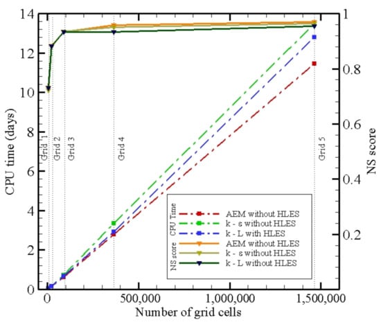 Turbulence modeling at different scales requires intense computational effort, and the more sophisticated the model, the greater the computer resources needed to store and process data. In addition, extensive performance analyses of turbulence closure models are rarely carried out when solving environmental problems. Most turbulence closure models are based on the Reynolds-averaged Navier–Stokes (RANS) approach and are used to characterize small scales in terms of both space and time []. Due to their simplicity, zero-equation models are widely applied, since they consider mean variables and the turbulent motion is grouped up in an energetic scale [,]. There are also one- and two-equation turbulence closure models, such as the and models, respectively. Such models, available in several open-source or in non-free numerical models, have been applied to a wide variety of flows in many tests and applications, achieving reasonable success []. In addition, when selecting a particular model, factors such as the data available for calibration and validation of its coefficients, computer resources, and the user expertise should be considered.