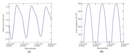 For the initial conditions, a uniform temperature of 29.4 °C was assumed over the entire computational domain. The velocities were set to 0 m/s, and the water level was set to the first data of the tide considered. The reference density was set to 1024 kg/m3, and a constant salinity was fixed to 33 ppt. Since the seabed is mostly composed of sand, a Manning roughness coefficient of 0.025 s/m1/3 was selected []. A free slip boundary condition was chosen for the wall roughness, and open boundary conditions were implemented as shown in Figure 4. Ocean currents generated with the HYCOM model were assigned at both the northern and southern open boundaries. Tides for the simulation period (Figure 5a) were obtained from the Centro de Investigación Científica y de Educación Superior de Ensenada, Baja California (CICESE) and set up at the eastern open boundary. Because of the lack of data in the specific location, the total solar radiation (Figure 5b) considered in the heat flux model was adapted from [], whose case study is near the LVNPP. Other values used to configure the heat free surface flux model and wind stress at the free surface, such as the air temperature, cloud coverage, relative humidity, wind speed, and wind direction (Figure 5c), were obtained from the Veracruz airport [].