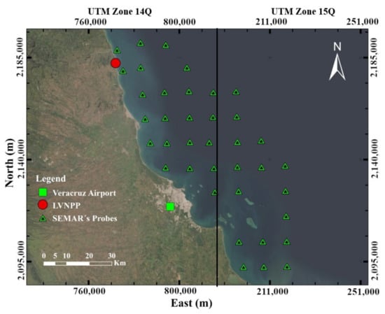 The case study is the thermal plume discharged by the LVNPP in the coastal zone of Veracruz State, Mexico, located in the Gulf of Mexico (GOM) (Figure 1). The LVNPP covers an area of about 400 ha and has two main reactors, each with a production capacity of 810 MW, providing clean energy at a rate of 5% of the Mexican national electricity system. A flow of seawater of 63 m3/s is withdrawn via the intake structure [] to cool the heat exchangers down, and this water flow is returned to the sea through a 50 m wide channel after the cooling process. The mean estimated temperature difference between the inflow and outflow is 7 °C.
