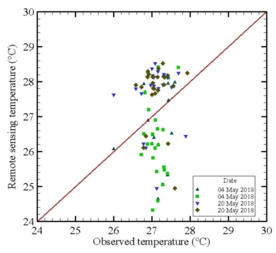 Temperature patterns obtained by RS were compared against a wide area of field measurements of the Secretaría de Marina (SEMAR) of Mexico. Field testing was performed from 9 to 12 May 2018. Figure 6 shows the location of the measurement points. Comparisons were made with four L8 TIRS images: two taken on 4 May and two taken on 20 May 2018. It should be stated that it was impossible to match the testing dates with the satellite overpass time; however, given the spatial self-correlation [], the proximity between those dates is considered acceptable, given the typical pattern of the seawater temperature in the zone. Notice that the field measurements were taken in a very extended area, compared with the computational domain of numerical simulations, which is why numerical simulations were not validated with such field measurements. In this case, RS fields were a feasible alternative for the validation of numerical simulations once the RS data were properly validated.
