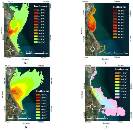 Isotherms obtained from RS: (a) winter, 25 January 2017; (b) spring, 17 May 2017; (c) summer, 19 September 2016; (d) fall, 8 October 2017.