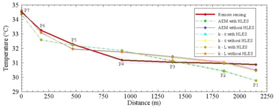 Figure 9 illustrates the temperature decay curves following the monitoring points, from P7, closest to the discharge, to P1, furthest from the discharge and closest to the intake structure (Figure 2). These results correspond to the date 17 May 2017 at 10:45 h, which is the time that matches the RS data of the same date (Figure 8b). The solid red line shows the temperature decay curve of the RS data, while the rest of the lines depict the simulated decay curves with the different turbulence closure models.