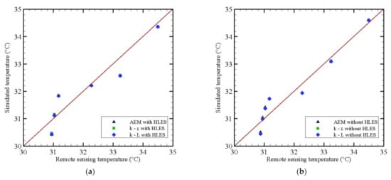 Data dispersion between RS temperatures and simulated temperatures at monitor points for different turbulence closure models: (a) with HLES; (b) without HLES.