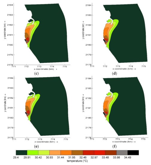 The results from analysis of both the hydrodynamic and thermal variables were consistent. For the hydrodynamic variables, it was observed that, at the outset, the plume is dominated by inertial processes due to the momentum induced in the discharge channel, and that it is later dominated by diffusive processes that are associated with the properties and characteristics of the coastal zone (Figure 13). The dimensionless number showed that, close to the discharge, the thermal transport is dominated by forced convection induced by the discharge. In the far field, the thermal transport is dominated by mixed convection associated with the properties and characteristics of the sea in the coastal zone.