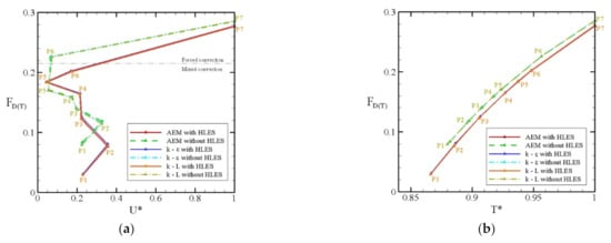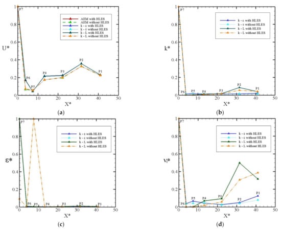 Figure 12 shows the evolution of the dynamic field from P7 to P1, following the plume trajectory. Figure 12a illustrates the evolution of , whereas Figure 12b–d show the dimensionless turbulent parameters , , and , respectively. One of the advantages provided by the model is that the transport of kinetic energy and its dissipation are calculated. The model does solve the kinetic energy transport equation; however, it does not solve the turbulent dissipation transport equation. To have an approximation of the turbulent dissipation when using the model, the semi-empirical relationship of Kolmogorov–Prandtl, Equation (9), was applied, although, as observed in Figure 12c,d, the results do not show coherence with those obtained from the model. The turbulent variables from the results of the AEM model were not calculated, since such a model does not even estimate the transport of kinetic energy. From the evolution of , it was observed that, between P7 and P6, the thermal transport was dominated by advective processes arising from the momentum introduced by the discharge channel, whereas, between P5 and P1, it was dominated by diffusive processes, which govern the transport of the plume due to the force induced by surface wind shear and the inertia of the coastal marine currents. Regarding Figure 12b–d, between P7 and P6, the decrease in the turbulence parameters is dominated by the momentum induced by the flow in the channel discharge. This is the area in which the turbulence, and consequently the dissipation, is highest. Between P6 and P1, the evolution of the turbulence parameters is dominated by diffusive processes induced by both the velocities and the temperature in the far field. There are differences between the calculations with and without HLES in the same way as there are in the mean flow.