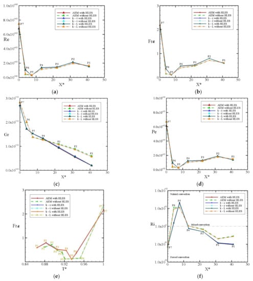 Figure 13 shows the evolution and impact of the thermal plume, including a comparison of dimensionless numbers that relate inertial and viscous force effects, natural and forced convection, heat transfer and thermal diffusion, and finally density and buoyancy effects []. Overall, the values from the models with HLES are higher than those without HLES, since an additional eddy viscosity is introduced by . The variation of with is shown in Figure 13a. In general, inertial forces predominate over viscous ones. It is worth mentioning that, from P7 to P6, higher values of are observed; this is expected, since the highest velocities are found near the discharge. The evolution of with is shown in Figure 13b. Near the discharge, inertial forces predominate over buoyancy ones up to P5. After this point, an equilibrium is observed between these two forces, with buoyancy forces slightly predominating over inertial ones, since the values of are lower than one. Figure 13c shows a plot of versus . The highest temperature gradients are found between P7 and P6, and, as expected, the highest values for are observed at these points. From P6 to P1, the values of are smoothly reduced as the thermal plume approaches the intake structure. Overall, buoyancy forces dominate over viscous ones. The variation of is shown in Figure 13d. Between P7 and P6, a predominance of convective forces over diffusive ones is observed, due to the momentum introduced by the discharge channel. Although the curves drop down significantly at the remaining points, the process remains dominated by convective forces since the diffusive ones are not strong enough to counteract them. Figure 13e illustrates the relationship between and . Between P7 and P5, inertial forces predominate over viscous and buoyancy forces. From P5 to P1, an increase in the buoyancy forces tends to counteract the inertial forces, since the curves tend towards = 1.
