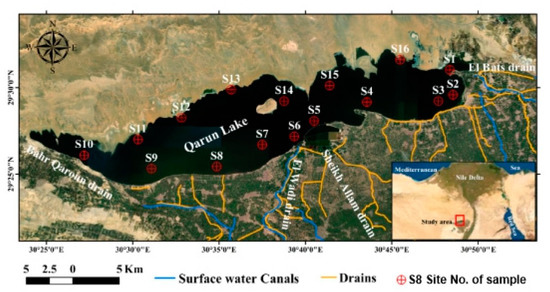 Qaroun Lake is a natural inland saline lake and represents one of the main geomorphological features of the Egyptian Western Desert. It is a place for fisheries, salt production, tourism, and migratory birds in the Autumn and Winter seasons, in addition to being a natural discharge area for El-Fayoum province [10,11,12]. The Qaroun Lake area distinguishes itself by its richness in terms of biodiversity, geological formations, and archaeological sites. Furthermore, the lake is a globally significant wetland for Autumn and Wintering migratory water birds. Consequently, in 1989, it was designated as a natural protectorate according to Law 102/1983 by Prime Ministerial Decree No. 943/1989 [13]. In addition, it was originally a freshwater lake and changed into a saltwater habitat [14]. El-Fayoum province discharges a massive amount (more than 450 million m3/year) of untreated agricultural, industrial, aquacultural, sewage, and domestic effluents into the Qaroun Lake [15,16,17,18,19,20,21]. The lake has no surface outlet and loses its water through evaporation processes only. This causes a gradual increase of lake water salinity and their pollutant content, depending on the evaporation rate and the quantity of drainage water inflow [15,19,22]. As a result of the accumulation of pollutants, the environmental quality of the Qaroun Lake will change and affect the food chain and ecosystem [23,24]. Consequently, economic activities such as fishing, and tourism will stop. Moreover, migratory birds will be affected by the lake’s environmental degradation. The Qaroun Lake is subject to deterioration, as evidenced by previous studies carried out by El-Kady et al. [12]; Attia et al. [11]; Redwan and Elhaddad [25]; Abdel Wahed et al. [18]; El-Sayed et al. [10]; Soliman et al. [24]; Barakat et al. [17]; Abdel-Satar et al. [14].