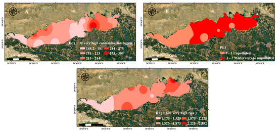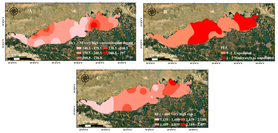 Spatial distribution maps of sediment quality indices: (A) Degree of contamination (Dc); (B) Pollution load index (PLI); and (C) potential risk index (RI) in the year 2019.