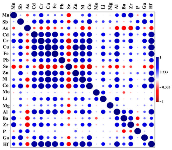 Pearson correlation matrix of heavy metals in surface sediments. For colour, blue colour means positive correlation and red colour means negative correlation. The size of the circle refers to the degree of correlation.
