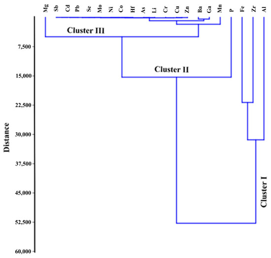 Figure 5 shows the dendrogram resulting from the cluster analysis of metal concentrations in Qaroun Lake sediments. There are four main groups of clustering that have been detected in the CA results for tested elements. The first one is a grouping of the metals Al, Fe, and Zr (Cluster I), and the second one is composed of P (Cluster II). The third cluster (Cluster III) included Mg. The last group (Cluster IV) was further split into two sub-clusters, one group containing Mn and the other one grouping Sb, Cd, Pb, Se, Mo Ni, Co, Hf, As, Li Cr, Cu, Zn, Ba, and Ga.