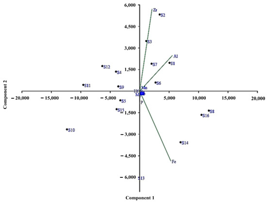 The results of a PCA for the 21 tested elements in Qaroun Lake sediment samples are shown in Table 8 and Figure 6. Three significant components explain in total 99.776% of the variance were selected. The first component (PC1) explained 80.998% of the total variance was predominated by large positive loading of Al, Fe, and Zr (loading 0.69767, 0.66589, and 0.26369 respectively) especially from sampling sites S1, S2, S3, S6, S7, S8, S14, and S16. The second principal component (PC2) explained 13.696% of the total variance and mainly composed of P, Mn, Ba, Mg, Zn, and Ga (loading −0.09366, 0.032219, 0.016643, −0.012688, −0.003363, and 0.0055782 respectively). The third (PC3) one explained 5.0824% of the total variance.