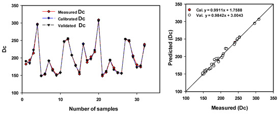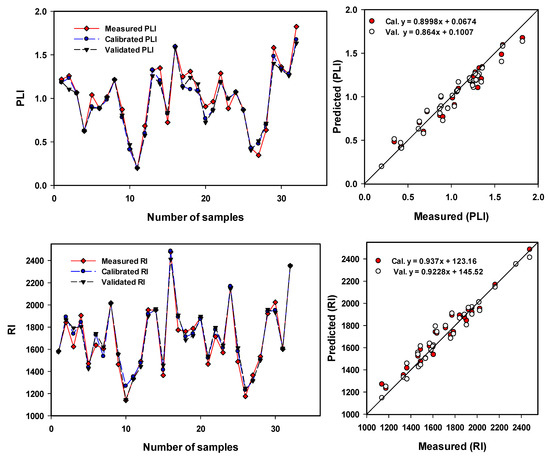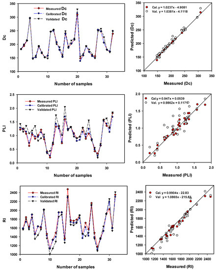 In Table 9, the calibration (Cal.) models presented the best performance efficiency to predict the PLI, RI and Dc, based on the 21 selected elements, with R2cal = 0.961–0.991 and with ACCc = 0.981–0.999 for PLSR, and with R2cal = 0.947–0.996 and with ACCc = 0.976–0.998 for MLR. The validation (Val.) models also presented the best performance efficiency, with R2val = 0.948–0.989 and with ACCv = 0.984–0.999 for PLSR, and with R2val = 0.760–0.979 and with ACCv= 0.867–0.984 for MLR. The Val. Model of the PLSR method performed better efficiency to predict the PLI than the Val. Model of the MLR method (Table 9; Figure 7 and Figure 8). In general, the Cal. and Val. models of the PLSR method showed barely higher values of R2 and ACC and lower values of RMSE and MAD than the MLR method for RI and Dc. For example, the R2val, ACCv, RMSEv, and MADv for RI of PLSR models were 0.951, 0.989, 70.270, and 55.823, respectively, while the R2val, ACCv, RMSEv, and MADv for RI of MLR models were 0.930, 0.955, 117.487, and 93.095, respectively. The optimum LVs were 3, 5, and 3 for the calibration PLSR models of PLI, RI, and Dc, respectively. A comparison between measuring datasets, calibrating datasets, and validating datasets for three pollution indices using the PLSR and MLR models is shown in Figure 7 and Figure 8. Hence, the results showed that there were no clear overfitting and underfitting between measuring, calibrating, and validating datasets for PLI, RI and Dc. Moreover, the models of Cal and Val of both PLSR and MLR showed good slopes between measured and predicted data of the PLI, RI, and Dc and the value of the slope of the two models varied from 0.864 to 1.087. Thus, these results confirm that PLSR and MLR models including 21 elements as input data can be used as alternative methods to estimate the three pollution indices.