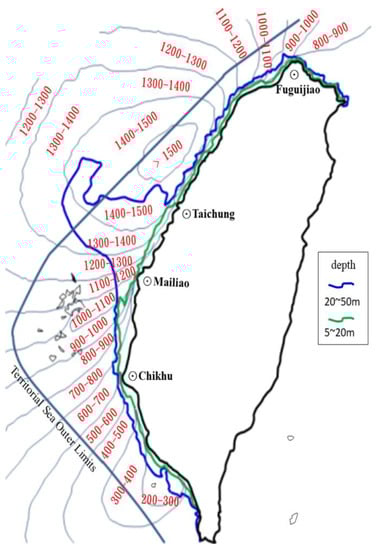 According to the observation of the world’s average wind speed in 23 years, 16 of the world’s top 20 wind farms are located in the Taiwan Strait [10], indicating that the western sea of Taiwan’s own abundant wind energy resources has great potential for building offshore wind farms. However, it is noteworthy that not all of Taiwan’s western sea is adequate for such development. According to Figure 1, the sea area is located from the northernmost point of Taiwan (Fuguijiao) to the southernmost point (Chikhu), with a water depth of less than 50 m and the average wind power density being more than 600 W/m2 or even more than 1500 W/m2, making the water area the best sea for wind energy development. Although some parts of the northern sea are 60–80 m deep, the difficulty of establishing wind farms can be overcome technically. Figure 1 shows that the shallow water area with a water depth of 5–20 m has a potential wind energy of 9 GW, the water area with a depth of 20–50 m has a potential wind energy of 48 GW, and the deep water area with a depth of more than 50 m has a potential wind energy of 90 GW [11].