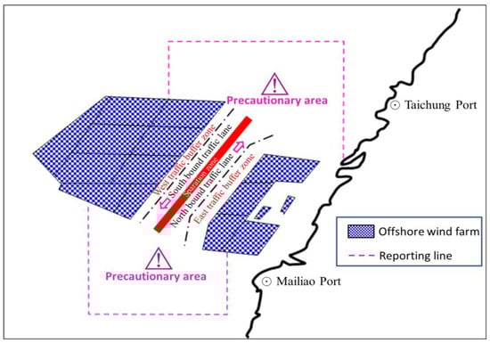 A total of 98% of Taiwan’s primary energy source depends on imported energy [22]. With its west coast’s great wind energy potential, Taiwan has actively promoted the wind energy development policy to meet the challenges of the gradual exhaustion of fossil fuels and the intensification of the greenhouse effect in recent years. The total installed capacity of offshore wind farms in Taiwan is estimated to reach 5.6 GW by 2025 and 15.6 GW by 2035. If the current 8-MW mainstream wind turbine is used, there will be about 1950 wind turbines in the western sea of Taiwan by 2035. All the offshore wind turbines will be built in the territorial sea and internal sea from Mailiao in the middle of Taiwan to Fuguijiao in the north (Figure 2). Such a large number of offshore wind turbines must have great effects on navigation safety in this area.