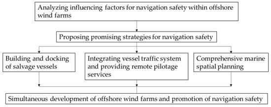 The Taiwan Strait, to the west of Taiwan, is rich in wind energy resources and has the greatest offshore wind power potential in the world. Therefore, Taiwan has been actively expanding its offshore wind power industry in this area in recent years and expects to achieve the total installed capacity to 15.6 GW by 2035. Due to the large vessel traffic flow in Western Taiwan’s sea area, wind farms will inevitably reduce the navigable space and shadow some existing marine aids to navigation, thus worsening navigation safety. An approach using a fault tree analysis was used to carry out analysis of collision risk between ship-to-ship and ship-to-turbine. The vessel density distribution and traffic flow within the open sea of offshore wind farms would further increase to curtail the available navigable space. The shadowing effects along navigation channels would thereafter be worsened to raise the probability of collision risks in the sea. The results of the fault tree analysis revealed that if the ship is out of control, the time allowed to provide assistance is rather short, leading to the increase of collision risk extent between ships and wind turbines. Moreover, the study also found that unfit functions of the Vessel Traffic Service System and navigation aids and frequently and arbitrarily crossing the navigation channel of fishery vessels are the main causes of ship collisions. In order to effectively improve the navigation safety, competitive strategies for navigation safety are investigated and evaluated in this study. These strategies include making a complete plan for utilizing the whole sea, integrating the offshore vessel traffic service and management system, providing remote pilotage services, and building salvage vessels. The above promising strategies would enhance the navigation safety within the open sea. Collision risk might occur once marine accident occurs and no salvage vessel is available.