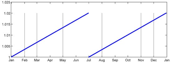If the vessel begins operation on 1 January having a biofouling coefficient with a value of 1 and rises to a value of 1.02 by 30 June, the vessel can be cleaned at the half-year mark on July 1 such that the biofouling coefficient drops back down to 1. Figure 3 shows the time evolution of the biofouling coefficient.