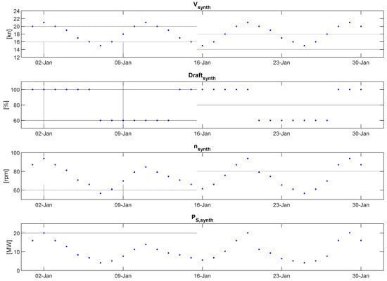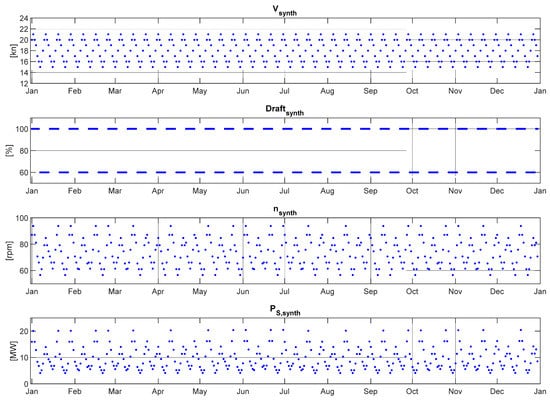 Figure 4 shows the resulting vessel synthetic speed (Vsynth), synthetic draft (Draftsynth), synthetic rate of propeller rotation (nsynth), and synthetic shaft power demand (PS,synth) with the biofouling coefficient already applied.