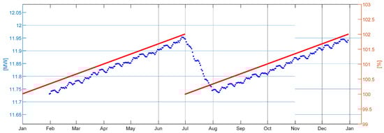 Then, using regression analysis of Equation (26) over the 30-day data selection shown in Figure 5 would be possible to obtain the values , and using Equation (27) would yield .