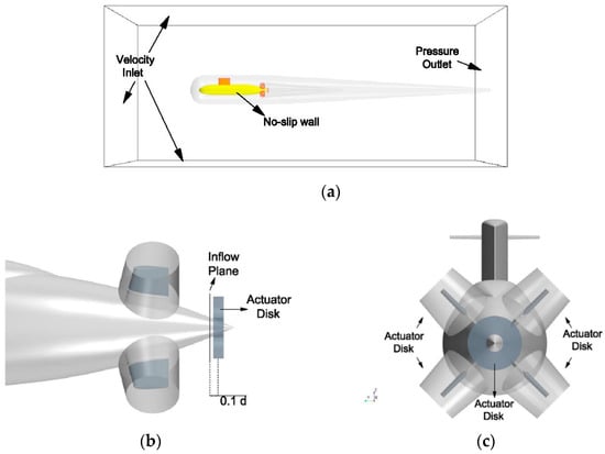 Normally, viscous numerical methods, such as RANS CFD, detached eddy simulation, and large eddy simulation, have the most potential to capture viscous effects accurately around the propeller. However, when these methods are carried out, the propeller time scale is smaller than the ship time scale, which results in even more costly solutions because the ship must be analyzed with the propeller time scale as Bradford’s [31] work. In other words, using the CFD method to simulate the real propeller directly requires a significant amount of time and computing resources; under the circumstances, the body force approach came up (Oda [32]) and was quickly applied to study the disturbance between the propeller and ship body (Kawamura and Miyata [33]; Nakatake [34]; Stern [35]). In research on underwater vehicles, this method has been widely used according to its eligibility in a study on the ship propeller issue (Phillips [36]; Broglie [37]). Recently, UV’s free-sailing and self-propulsion study has adopted it as well (Dubbioso [38]; Sezen [39]; Li [40]). Therefore, in this study, an actuator disk to model the force of the propeller was used to analyze the turning motion ability of a self-propelled submarine. For an overview of the state of the art, the interested reader can be referred to the review conducted in previous work (Huang [3]; Han [41]).