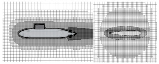 A CFD study of a UV is surely more complicated and difficult compared with surface ships due to the increase in the vertical degrees of freedom (pitch and heave). Since vertical control is related to the safe navigation of a UV, its prediction should be important as well. Zhou [21] simulated a submarine’s rising maneuvers in still water and waves and analyzed the feasibility and potential of a submarine’s emergency buoyancy maneuverability in a harsh environment through direct numerical simulation. Wu [22] used the multi-block hybrid grid and removable region method to simulate a UV-forced self-propelled diving maneuver, summarized and analyzed the maneuverability of a UV diving motion qualitatively. Carrica [23] used dynamic grid technology to numerically predict a submarine’s vertical zigzag maneuverability and verified the feasibility of the CFD calculation with experimental results.