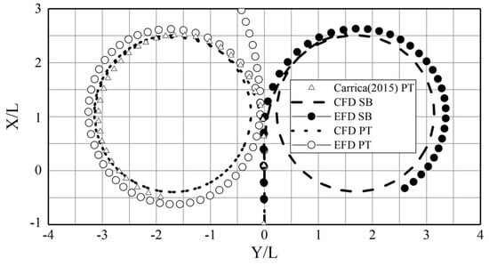 Table 6 shows the difference between the test and CFD turning motion parameter results, and the results are dimensionless according to the requirements of ITTC [42]. Figure 8 shows the comparison of the left and right rudder trajectories predicted by CFD with the test results and Carrica’s results shown in the graph as well. The comparison only includes the tactical diameter and longitudinal distance in the test and CFD prediction, since the test did not perform a complete turning operation. The results show that the trajectory obtained by the CFD numerical prediction is in good agreement with the test results. While the error between the 180° turning time of the left turn is 10.19%, the other turning motion parameters can be within 10%. The CFD simulation in this study can better predict the free sailing maneuver characteristics of the submarine and provides an effective pre-evaluation method for evaluating the maneuverability of the submarine.