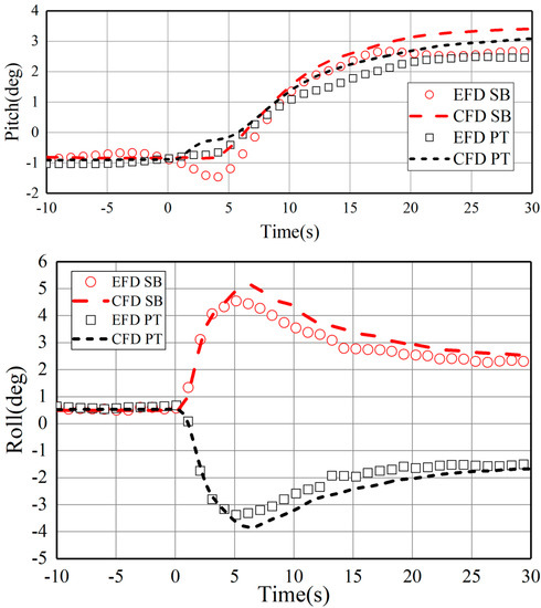 Figure 9 shows the time history curve of the pitch angle and roll angle. The results show that the submarine presents a slightly bow-down posture during the straight-line sailing. During the turning maneuver’s progress, the submarine is affected by the hydrodynamic force and affected by a bow-up moment, and the steady-turning submarine reaches and finally maintains a stable bow-up angle. This may be due to the external force generated by the control plane surfaces, resulting in a downward force around the tail of the submarine (Leong et al., 2016 [43]). The prediction results also reflect that the results of the left and right rudder rotation pitch angles predicted by CFD are about 0.7 deg greater than the test results, but because the CFD results are more inclined to the bow during the straight flight stage, the test results are based on the net change in the pitch angle, which shows good agreement with the CFD forecast results. In the process of the turning motion, the model tends to fall in, which is consistent with the general regular submarine’s rolling rule. The changing rate of the roll angle predicted by CFD at the beginning of the turning motion is basically the same as the test results; gradually and in the end, the value seems to be larger than that of the test. Since the CFD simulation is based on the six-DOF maneuvering motion, there is a certain coupling relationship between the pitch angle and the roll angle; therefore, the prediction error of the pitch angle also affects the prediction result of the roll angle.