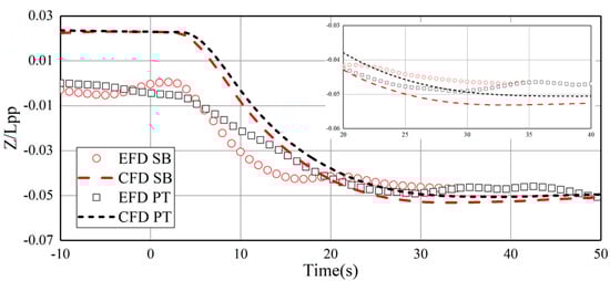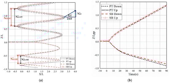 Figure 19 shows the projection of trajectory on the X–Z plane and the evolution of the depth. The curves of submergence seem to be sharper than the rising curves, and the results of the two depth changes are closer between portside and starboard side turning, while the change trend of the submergence maneuver is gentler. Generally, the change of depth while the model heading is 360 deg is defined as the lift distance, . According to the CFD prediction, the lift distance for the portside and the starboard side turning is 0.66 and 0.65 while rising, and −0.36 and −0.33 during submergence, respectively. From the results, when the model submerges, part of the bow-down moment caused by the stern planes is balanced by the bow-up hydrodynamic moment that reduces the submarine’s pitch angle and slows the tendency to submerge.