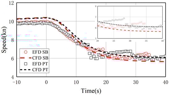The change curve of the submarine speed is shown in Figure 11. The results show that CFD can predict the speed reduction in the model in good agreement with the experimental results. It can be seen from the figure that the right turn speed of the CFD has further decreased, from about 10 knots to less than 6 knots. This phenomenon indicates that the submarine received more resistance when turning to starboard. Figure 9 shows that the submarine presents a greater bow lift when turning right, which also causes greater resistance in the sailing direction and make the model slower.