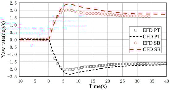 Figure 12 shows the evolution of the yaw rate. The results show that the changing trend of the yaw rate is slightly over-predicted by CFD but totally consistent with the experimental results during the steady turning process. The yaw rate gradually decreases and converges to a stable result and is larger than those of the test, both in portside and starboard side turning, which leads to a better turning performance. It is interesting that CFD predicts the speed drop in the turning process well. Figure 11 shows that the speed drop is basically the same as the test results, which means that at the same speed, the turning trajectory predicted by CFD will be more compact, that is, the turning circle will be smaller. This is also consistent with the results shown in Figure 8.
