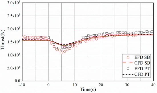 The propeller thrust results are shown in Figure 13; when the model starts turning, the thrust of the propeller drops significantly. The test thrust drops by up to one-third, while the CFD-predicted drop is only about 12%, which may be because of the heavy attack on the stern’s surface. The body force propeller used in the software uses an approximate model to replace the real propeller, ignoring the effects of blades and gaps; thus, the captured incoming flow cannot completely simulate the real flow field. When the speed is reduced from 10 to 6 knots, that is, after entering stable turning, the thrust is increased by about 14% compared with the direct flight state. The CFD prediction results are in good agreement with the test results. At the same time, the propeller thrust is well predicted when turning to the starboard side. At the beginning of the turning, the yaw rate and the transverse velocity increase rapidly, as shown in Figure 12; thus, the inflow in front of the propeller plane increase as well and may be larger than the velocity of the vehicle, and the influence of the yaw rate and transverse velocity makes the freestream velocity increase while the vehicle speed decreases. Thus, the axial velocity of the propeller increases, and as a result. Additionally, with the turning motion continuing, the influence of the decrease of vehicle speed dominates, and the thrust begins to increase, which can be proved by the curves of yaw rate, since the yaw rates are basically constant after t = 10 s.