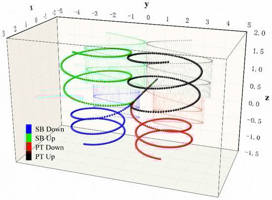 When the submarine is diving and floating underwater to achieve the tactical goal of changing depth, it may maneuver with a turning motion to avoid attacks or just to ensure the comfort of the crew. The space spiral maneuver is the most common, and normally the submarine deflects its rudders and stern-planes to a predetermined degree—sometimes it only needs its rudders—and the submarine gradually moves into space and spirals. In the simulation, the vertical command is sent by the autopilot, and at the beginning of the CFD prediction, the submarine self-propelled and sailed directly into deep water at a speed of 1.2 m/s (10 kn for full scale). At t = 0 s, the effective rudders rotate ±20 deg, and at the same time, the vertical command is set to ±8 deg for the autopilot. The 3D trajectory prediction diagram is shown in Figure 15. It is worth noting that the results show some interesting phenomena, which indicates that the submarine is in an underwater space. It has more complex maneuverability and combat performance during movement.