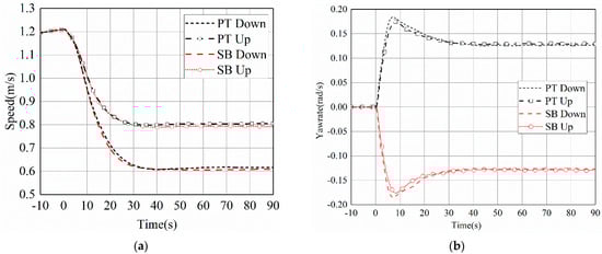 Figure 17 shows the time history curve of the pitch and speed. The speed of the submarine decreases and gradually converges to a stable value. According to the CFD prediction, the speed drops by about 30% when rising, while it drops by 45% when submerged. The turning diameter of a submarine is related to the speed and the efficiency of the rudder angle. The diameter of the rising maneuver will surely be larger because of the higher speed with the efficient rudder deflection angle of 20 deg, which is consistent with the X–Y plane projection of the CFD prediction. The yaw rates are also shown in Figure 17, which experienced an increased peak, and then decreased and converged to a stable result. The results of the portside and starboard side maneuvers show good consistency, while the rising results are a little bit larger than those while submerged. In general, the turning abilities of the space spiral maneuvers show little difference while rising and submerged; in other words, the effect of an efficient rudder is on the same level, and thus the ability to follow is hardly influenced by vertical control or the deflection of efficient stern planes. Based on the CFD prediction in Figure 16, a larger speed means a larger turning diameter, while a similar yaw rate, that is, the turning ability of submergence, appears to be better.