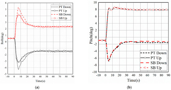 Evolution of roll (a) and pitch (b) for the space spiral maneuvers.