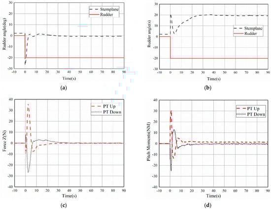 The evolution of the controller plane deflections, the forces at the Z–axis and the pitch moments of the portside turning spiral maneuver are shown in Figure 20. The (a) and (b) are actually the defections of the effective rudder and effective stern plane. The defections follow the commands of autopilots (PD controllers), and if the controller wants the vehicle to sail with pitch angle while turning, two commands are given: the horizontal angle is maintained by effective rudders, and the vertical motion (pitch angle) relies on the autopilot commands (transferred to effective stern planes). When the model rises, the autopilot input commands the model to bow up to 8 deg and the stern-plane deflection is more than 25 deg at the beginning. After the command is completed, the deflection decreases rapidly and is finally approximately equal to 0. However, the autopilot command does not seem to be well satisfied when the model submerges. The stern plane deflection is almost −20 deg during the whole spiral maneuver, which forces the model to pitch to −2 deg, rather than −8 deg, according to Figure 18. The comparisons of force and moment show that the submarine has the characteristic of “stern heavier” during the spiral maneuver; the model’s body is subjected to a bow-up moment while rising but is almost 0 while submerging, which means the moment of the sinking force balances the moment of the stern planes, that is, when the model is rising, these two moments are in the same direction and work together to make the model bow-up, and the autopilot only needs a small vertical command to make the stern planes deflect.