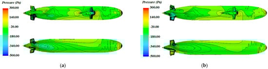 Figure 21 shows the surface pressure of the model body at t = 90 s. At this moment, the hull shows bow-up (a) and bow-down (b) motions. In general, during the turning motion, the flow field around the body changes, and the phenomenon “sidewash” shows up, which creates a pressure difference between the top and bottom of the model. The high-pressure areas are located around the shell, while the low-pressure areas are located at the tail zone and the forepart of the control planes at the top of the body; the pressure difference between these regions forms the sinking force. A distinct low-pressure area appears at the rear of the bottom, producing a bow-up moment, which is balanced with the stern planes moment and the sinking moment when turning. At the same time, an obvious pressure gradient appears from the starboard side to the port side of the hull, forming a lateral force pointing to the left side of the model, providing a turning moment for portside turning. A comprehensive comparison shows that the peaks in the high-pressure zone and low-pressure zone are higher during the rising maneuver, which also shows that the submarine receives a larger pitching moment and results in a larger pitch angle when rising.