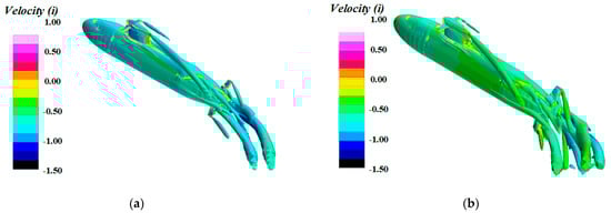 Figure 22 shows a vortex near the model’s body during the steady spiral maneuvers. The vortex structure on the leeward side is obvious as well as the separation phenomenon around the body’s surface when the hull is in the side wash. There are several tip vortices formed by the shell and its upper tip, and at the bottom of the shell, the horseshoe vortex extension merges with the hull vortex and is transported to the propeller area. At the same time, the chain vortex formed by the control planes is also merged with the body vortex at the stern, as well as the unique circular vortex that belongs to the body force propeller and the secondary vortex, which makes the flow more complicated at the stern zone. The phenomenon in the figure also shows that the vortex near the stern of submergence separates more thoroughly; however, the speed of flow seems to be smaller than it was during the rising maneuver. It can be seen also in Figure 17 that the speed drop is larger during submergence, as the separation surely interferes with the inflow of the propeller and has a negative effect on the maneuverability of the submarine.