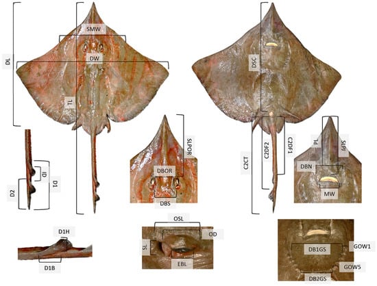 Morphometric measurements (MM) and total weight (TW) were recorded following [] to the nearest 0.1 cm and 1 g, respectively. In total, 28 measurements (Figure 2) were taken: total length (TL), disc width (DW), disc length (DL), snout-max width (SMW), snout length (preorbital) (SLPOR), Eyeball length (EBL), orbit diameter (OD), orbit and spiracle length (OSL) spiracle length (SL), distance between orbits (DBOR), distance between spiracles (DBS), distance snout-cloaca (DSC), tail length at 1st dorsal fin (C2DF1), tail length at 2nd dorsal fin (C2DF2), tail length between the posterior margin of the cloaca and caudal tip (C2CT), snout length (pre jaw) (SLPJ), pre-nasal length (PL), mouth width (MW), distance between nostrils (DBN), 1st gill opening width (GOW1), 5th gill opening width (GOW2), distance between first gill slit (DB1GS), distance between fifth gill slit (DB2GS), first dorsal fin base–length (D1BL), first dorsal fin height (D1H), first dorsal fin origin to caudal fin tip (D1), second dorsal fin origin to caudal fin tip (D2), distance between first and second dorsal fin inter-dorsal distance (ID).