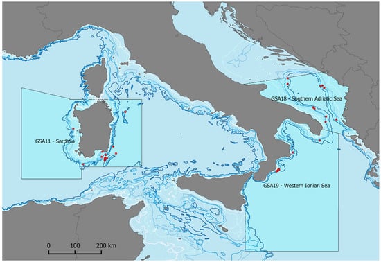 The sampling area includes the Sardinia Waters (Geographical Sub-Area (GSA) 11; GSA sensu General Fisheries Commission for the Mediterranean (GFCM)) by DCF and MEDITS survey, South Adriatic Sea (GSA 18) by DCF and MEDITS survey and North-West Ionian Sea (GSA19) by DCF (Figure 1). Thus, all specimens either came from the landing, discard or catches during MEDITS survey, or from experimental deep-sea trawl fishing campaign organized in GSA 11 by the University of Cagliari.