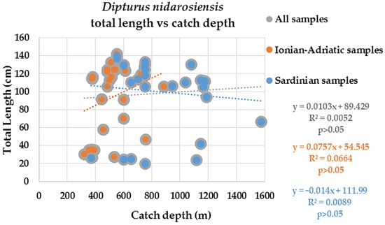 Some authors hypothesized a size segregation for the Norwegian skate [,]. Thus, the linear relationships between the TL and catch depth was tested by mean of the analysis of variance.