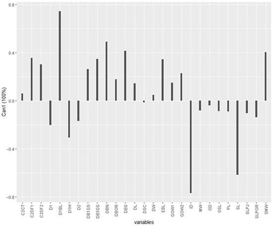 The correlation for each morphometric measurement with the canonical structure coefficients on the dimensions considered (Can1).