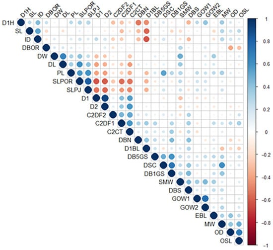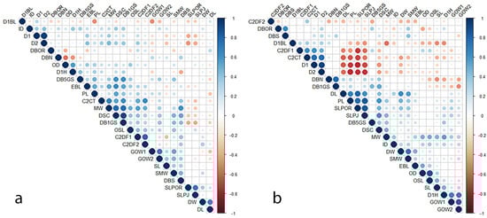 A correlation analysis (CA) was performed (linear correlation models) in order to select the MM mutually not correlated each other. The relationship between morphometric variables was evaluated by mean of the absolute value of Pearson’s correlation coefficient (r) and using a threshold of |0.5| to determinate the correlation between the MM []. In order to retain the highest possible number of MM in the analysis, an iterative selection process was used to reject the variables showing the highest number of correlations with the other MM.
